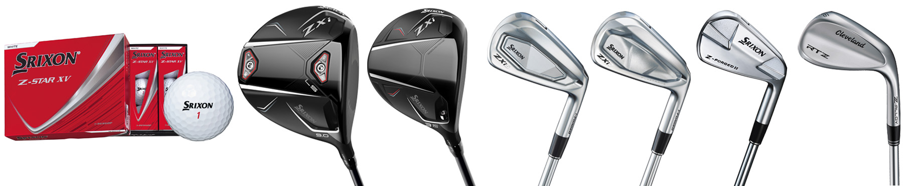 写真左から、NEW「スリクソン Z-STAR XV」、「スリクソン ZXi LS ドライバー」、「スリクソン ZXi フェアウェイウッド」、「スリクソン ZXi5 アイアン」、「スリクソン ZXi7 アイアン」、「スリクソン Z-FORGEDⅡ アイアン」、「クリーブランドゴルフ RTZ ウエッジ」