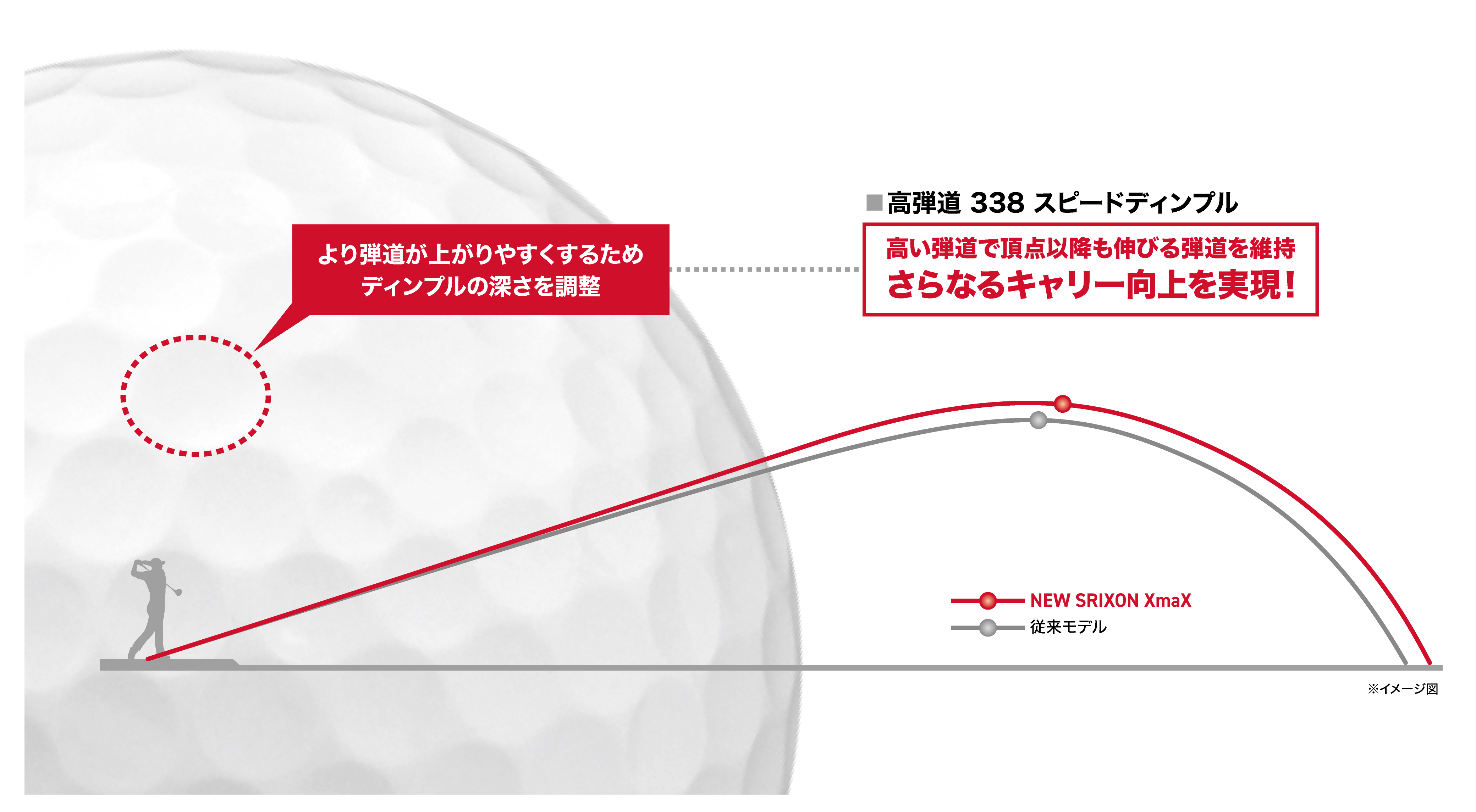 2.ディンプル深度を調整した「高弾道 338 スピードディンプル」が高い弾道を実現し、頂点後もスピードを維持し、伸びのあるキャリーを生み出します。