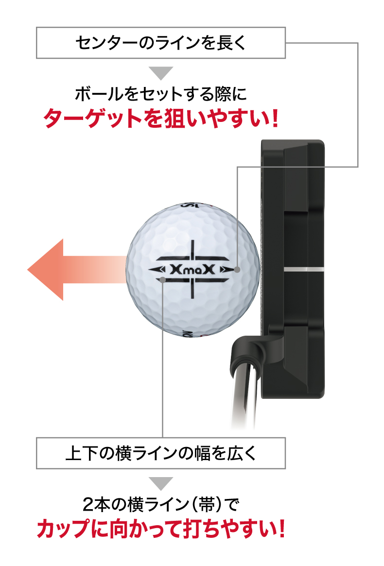 3.センターラインを長く配置することで、アドレス時のターゲット方向を狙いやすく設計しました。 さらに、上下に幅広の2本ライン(帯)を採用し、カップに向かってまっすぐ打ち出しやすい視覚効果を実現。