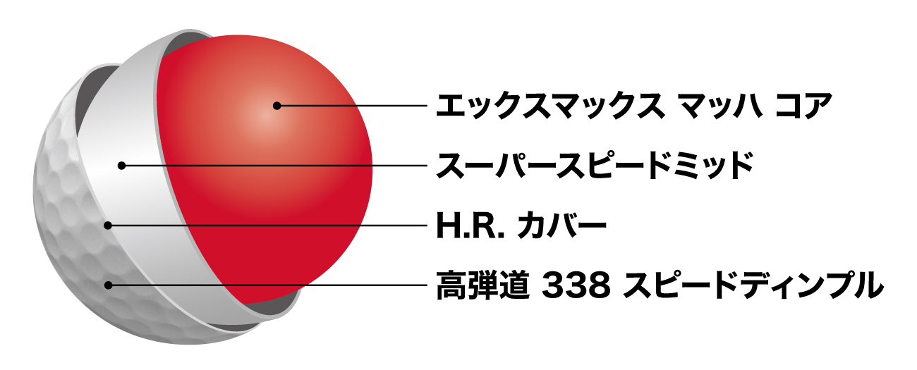 また「H.R. カバー」はスピン量を抑える設計となっており、これらの組み合わせにより、大きく飛び曲がりにくいボールに仕上がっています。