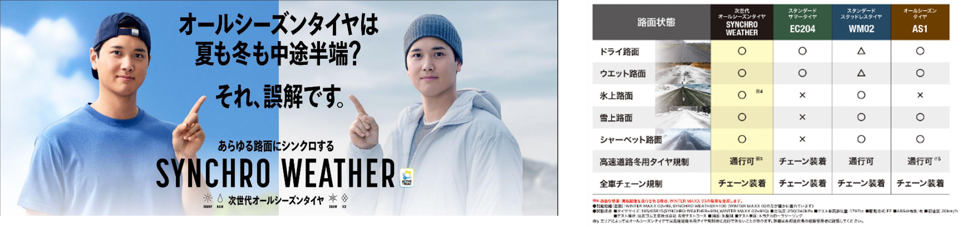 新CMでは、「オールシーズンタイヤは夏が苦手?」、「夏も冬も中途半端?」などの声に対し、二刀流を有言実行して人々の想像を超えてきた大谷選手が誤解を解きます。そして「SYNCHRO WEATHER」の性能の高さを力強く伝えます。